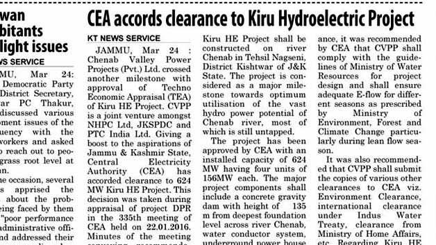 किरू एचईपी सीईए मंजूरी